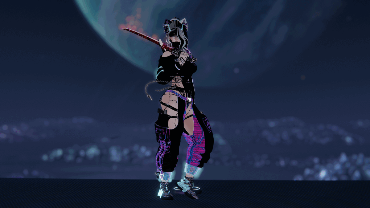 Jinxxy.com tags: vrchat, ears, belt, outfit, mask, pants, shoes, sneaker, sweater, weapon, underwear, nsfw, female, dps, physbone, cyber, cyberpunk